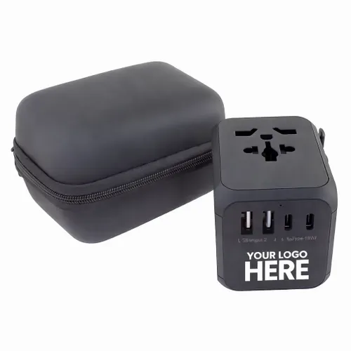 A travel adapter that is perfect for teams that need to travel often for business. Comes with Type-C ports and two USB ports that allow you to charge multiple devices simultaneously. Features: Covers more than 150 countries with US/EU/UK/AUS plugs Built-in safety shutters protect users from the direct touch of the live parts on the socket outlet Only one plug-type can be used at one time by sliding the knob selection, other plug-pins are locked automatically