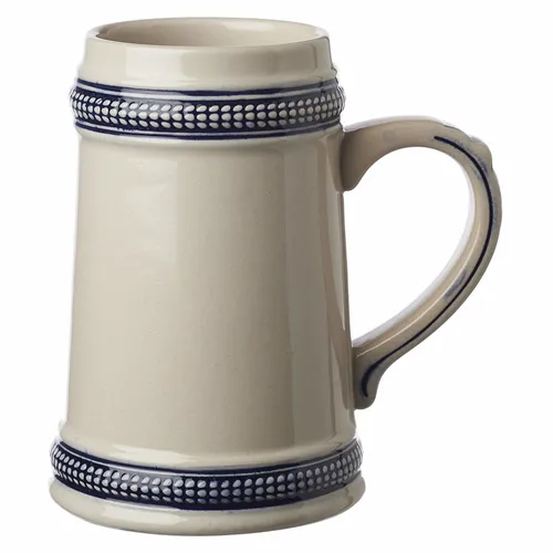 Custom Printed 18.5 oz. Blue Deco Beer Steins. Beige Stoneware Beer Mug with Cobalt Blue Accents. Great for Oktoberfest, Restaurants, Events, and More. Holds 18.5 oz. of Liquid. Recommended Hand Wash Only