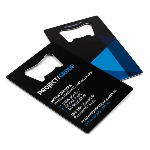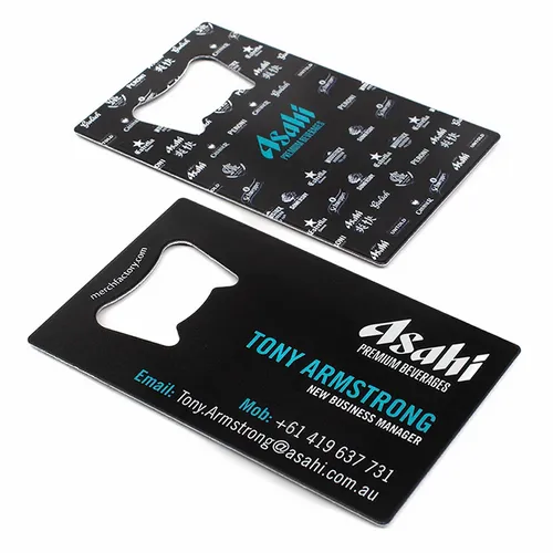 • Combine practicality with promotion using stainless steel bottle opener business cards. Each card features a fully functional bottle opener along with your branding etched directly into the metal for a durable, long-lasting finish. A unique and memorable way to keep your business in hand.
