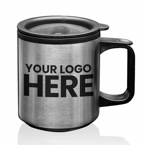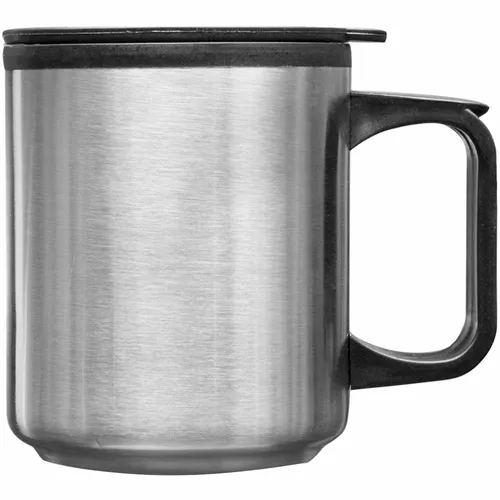 Stainless Steel Outer Shell Travel Mug. Double Wall Plastic Inner Lining. Plastic Lid with Spill Prevention Slide Lock. Easy Grab-n-Go Wide Grip Handle