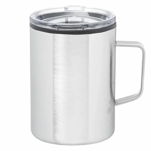 Stainless Camper Mug with Handle. Press-In Transparent Lid. Stainless Steel Exterior and Plastic Interior. Easy Grip to Grab-n-Go. EVA Bottom Pad. Wide Mouth for Easy Cleaning and Pouring Drinks