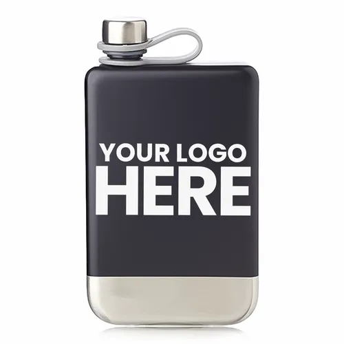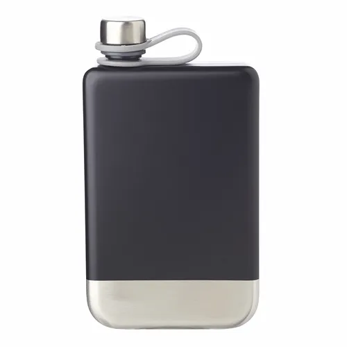 8 oz. Stainless Steel Hip Portable Canteen. Square-Shaped Single Wall Construction. Matte Black Body with Brushed Silver Bottom. Stainless Steel Screw-On Lid Attached to Silicone Strap for Safe Keeping