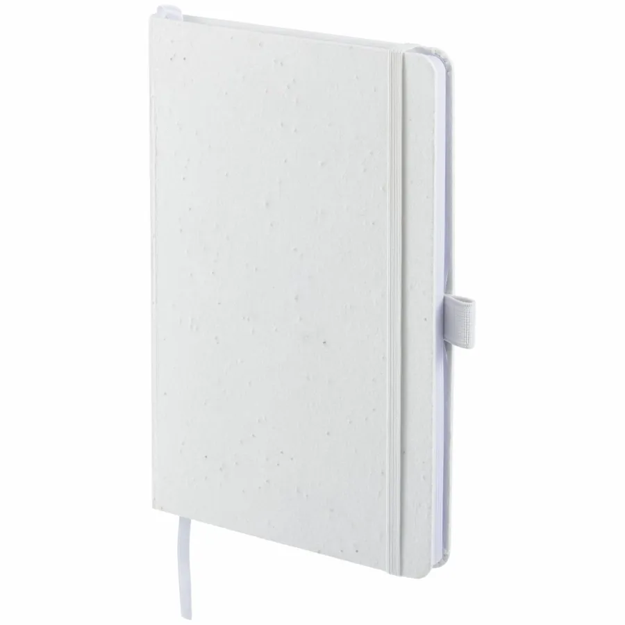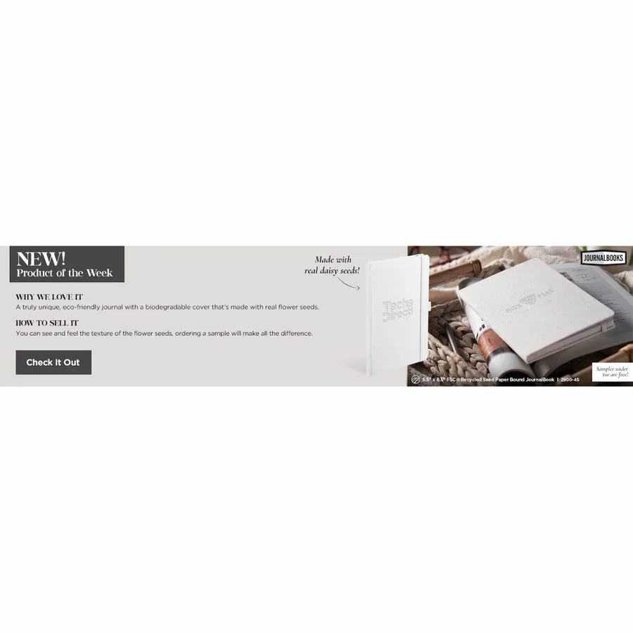 The 5.5 x 8.5 FSC Recycled Seed Paper Bound Journal features a biodegradable seed paper cover – made by mixing paper pulp with daisy seeds. The journal also includes 80 sheets of FSC- Certified Recycled lined paper. An elastic band, color-matching page marker ribbon, and a document pocket in the back provide exceptional organization when you’re on the move. The journal also features an integrated pen loop to securely hold your favorite pen. Through a partnership with 1% For The Planet, one percent of sales of this item are donated to environmental nonprofits.