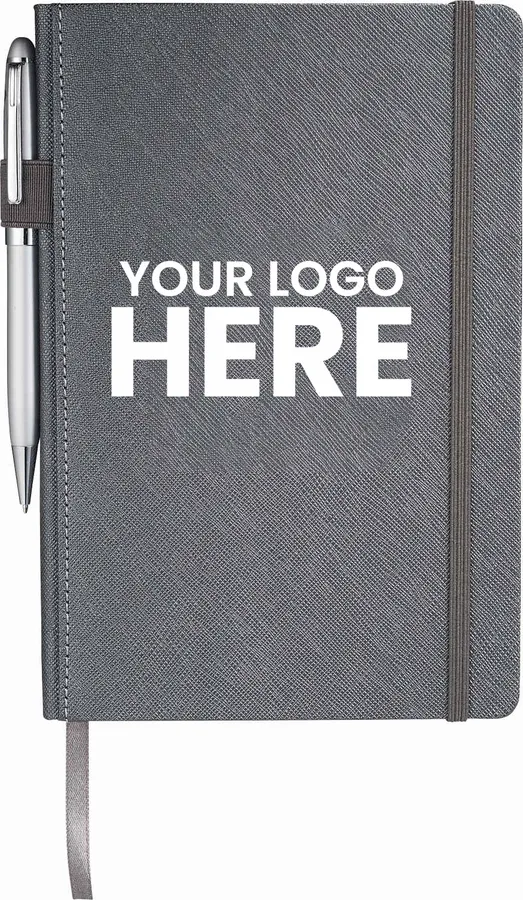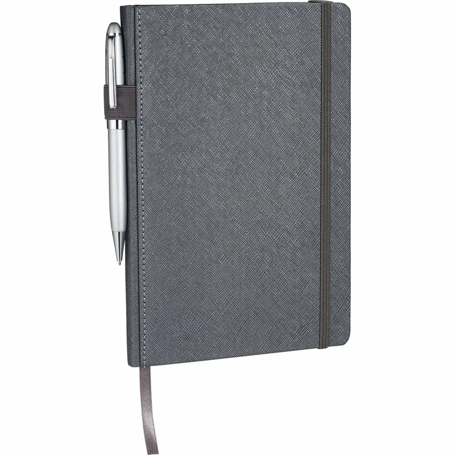 The 5.5 x 8.5 FSC Mix Modena Bound Journal features a premium, textured hard cover. This custom notebook includes an elastic pen loop on the spine and elastic closure. The Modena Bound Journal features a ribbon page marker, back document accordion pocket, and 96 white lined sheets of FSC Mix paper with color-matching painted edges.