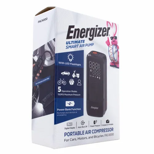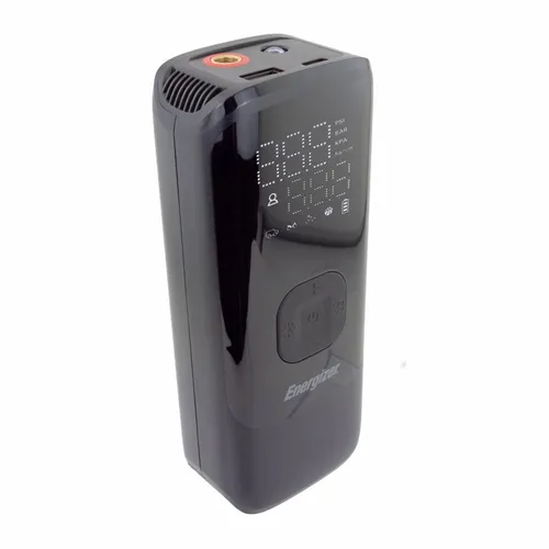 A portable and rechargeable electric tire pump with a large easy to view LED display. It has five inflation modes: automotive, motorcycle, and bicycle tires as well as a setting for sports balls. It also functions as a power bank with a USB output port located on top. Recharge the air pump's built-in lithium battery via its Type-C input port. It is packaged with a compact attachable air hose and a Type-C cable. AC wall adapter not included.