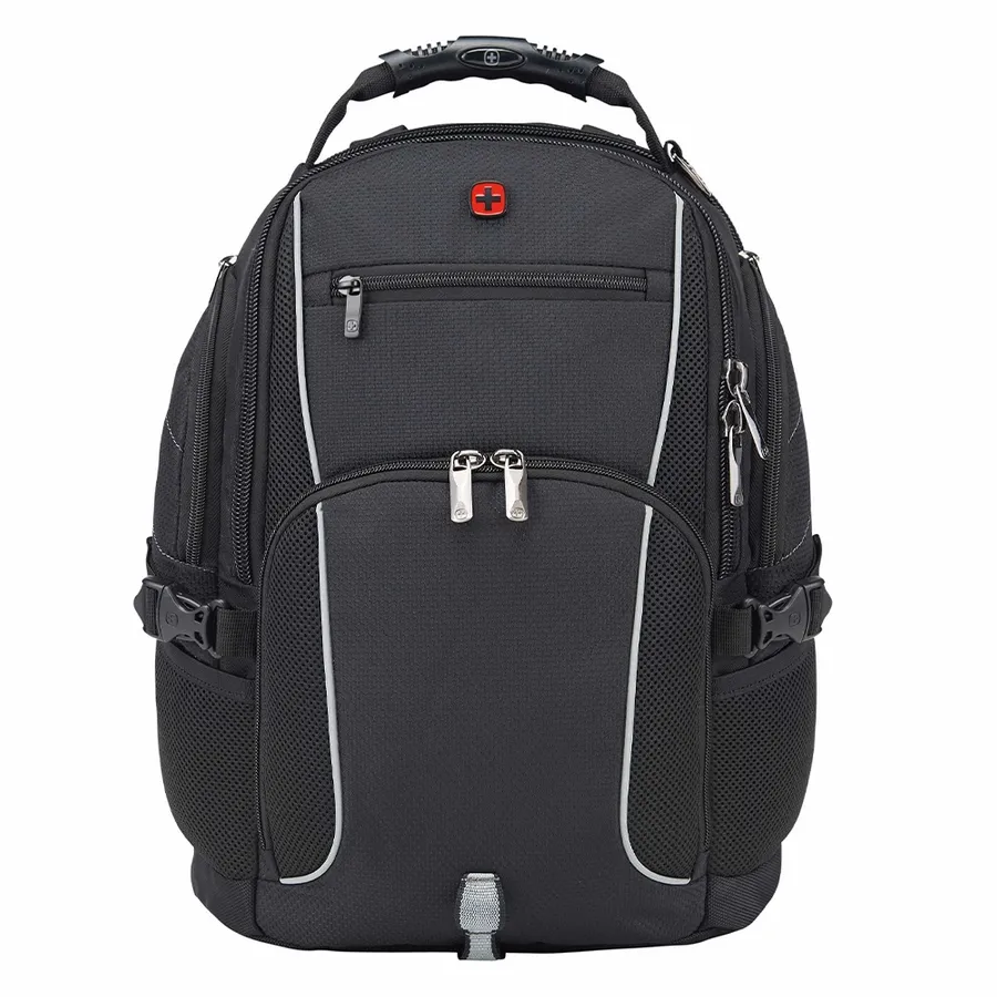 The Wenger Pro II Recycled 15 Computer Backpack combines style and luxury with sustainability. Made from eco-friendly RPET, this backpack has it all: a 15” computer sleeve, dedicated USB port with cable compartment, adjustable buckle compression straps, two side mesh water bottle pockets and a dedicated phone pocket on the shoulder strap. Organize your valuables in the easy-access, lined front pocket, the zippered mesh pocket on the interior front wall, front organizational pocket, back pocket with RFID protection or in the large zippered main compartment. This backpack features Wenger’s Airflow moisture-wicking mesh, shock absorbent backpack strap and an adjustable chest strap.