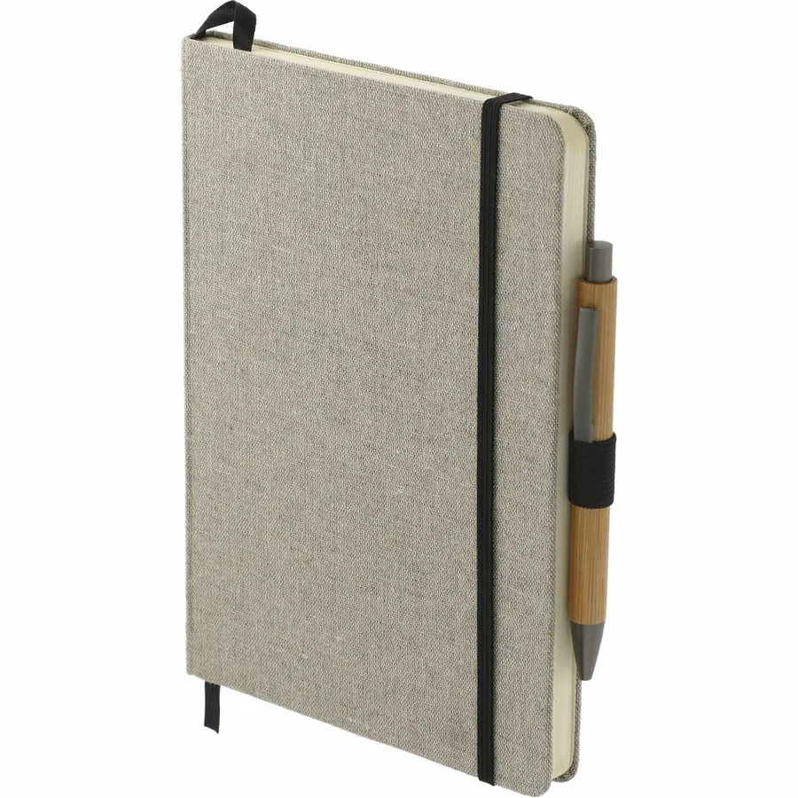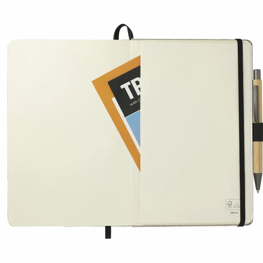 The 5.5 x 8.5 Recycled Cotton Bound Journal Set includes (2800-94) 5.5 x 8.5 Recycled Cotton Bound Journal and (1066-49) Bamboo Quick-Dry Gel Ballpoint. The 5.5 x 8.5 Recycled Cotton Bound Journal is the perfect journal for all of your notetaking needs. Features a recycled cotton, hard cover. Natural color elastic closure, pen loop and ribbon page marker. 80 sheets of FSC Mix cream lined paper. Back document pocket. FSC label printed inside. Through a partnership with 1% For The Planet, one percent of sales of this and all EcoSmart products are donated to environmental nonprofits.