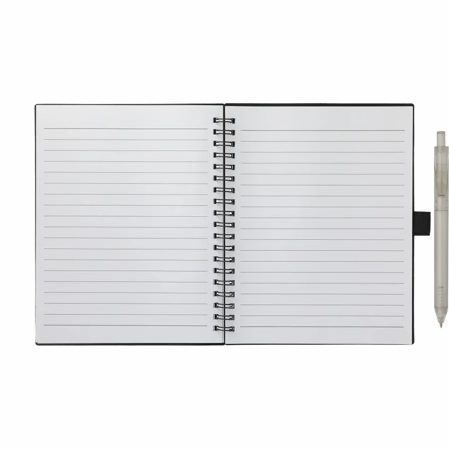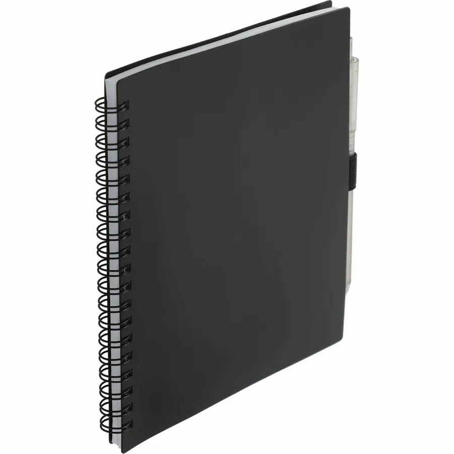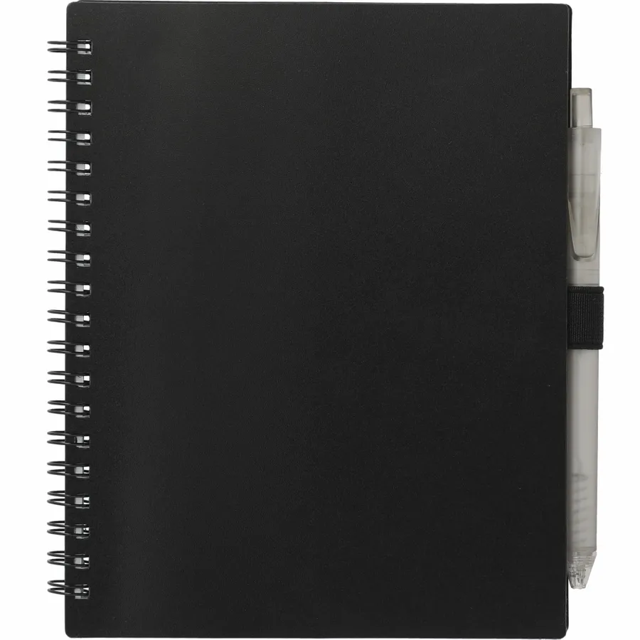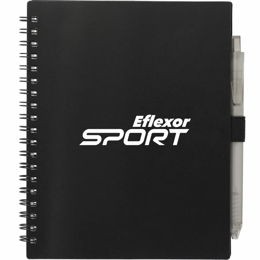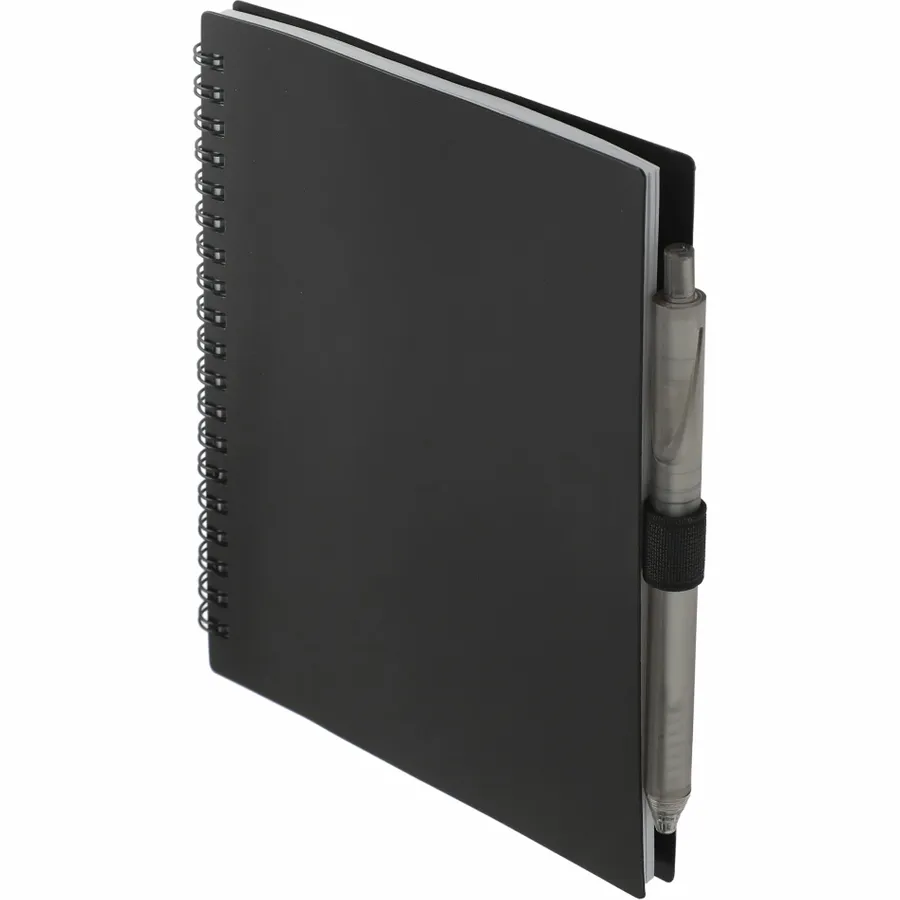 The 5.5” x 7” FSC Recycled Spiral Notebook with RPET Pen features a 100% recycled polypropylene, hard cover with 70 sheets of white lined FSC-certified paper. Black metal wire binding paired with black elastic pen loop. Includes 100% RPET barrel pen with black ink cartridge. Through a partnership with 1% For The Planet, one percent of sales of all EcoSmart products are donated to environmental nonprofits. Note that pens are packed separately.