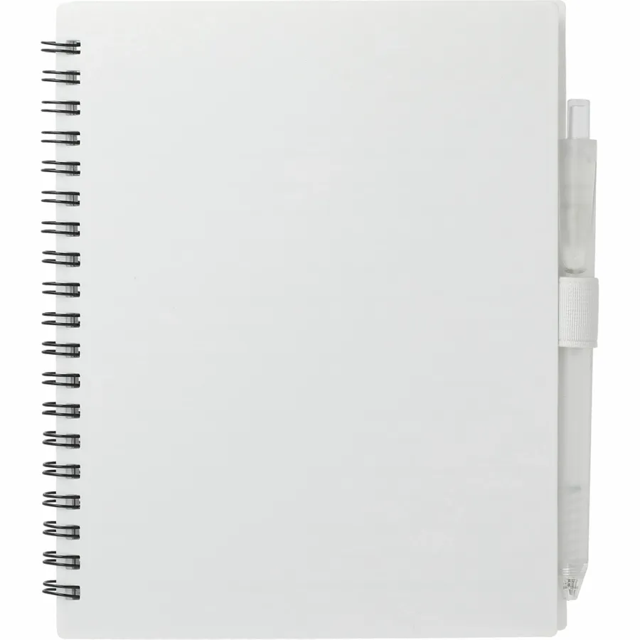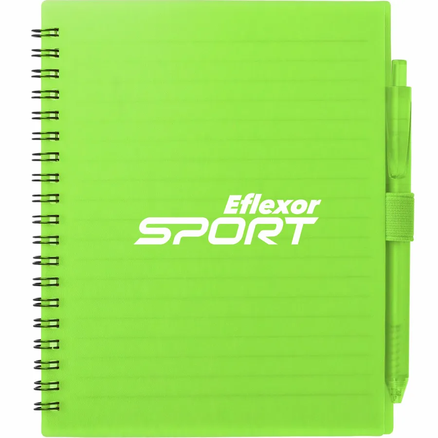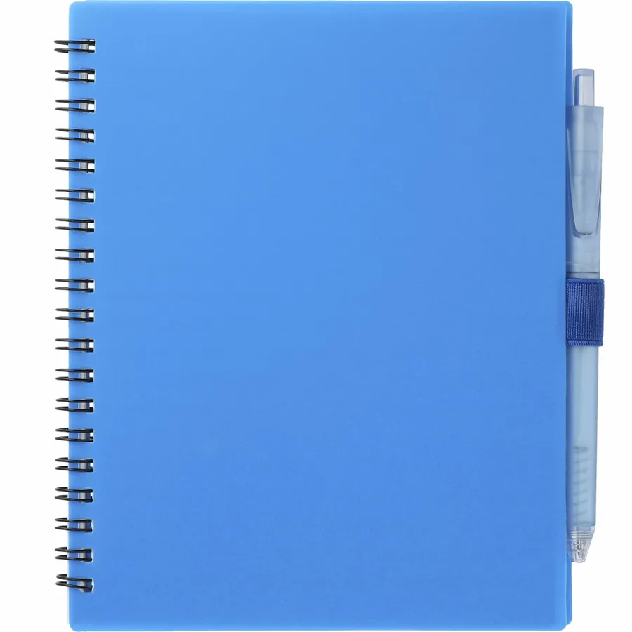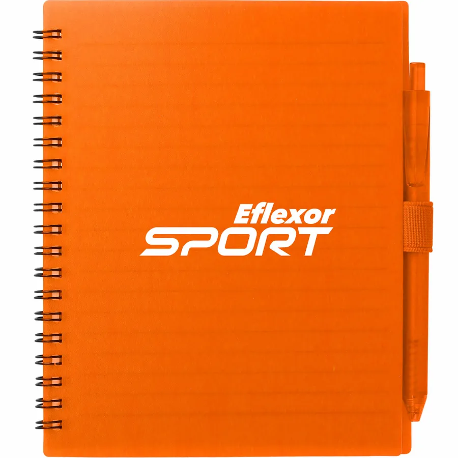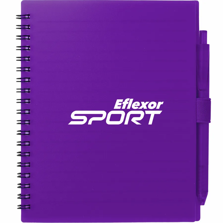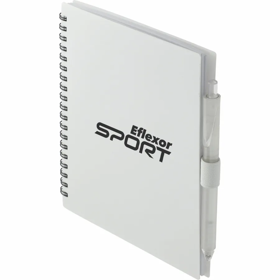 The 5.5” x 7” FSC Recycled Spiral Notebook with RPET Pen features a 100% recycled polypropylene, hard cover with 70 sheets of white lined FSC-certified paper. Black metal wire binding paired with black elastic pen loop. Includes 100% RPET barrel pen with black ink cartridge. Through a partnership with 1% For The Planet, one percent of sales of all EcoSmart products are donated to environmental nonprofits. Note that pens are packed separately.