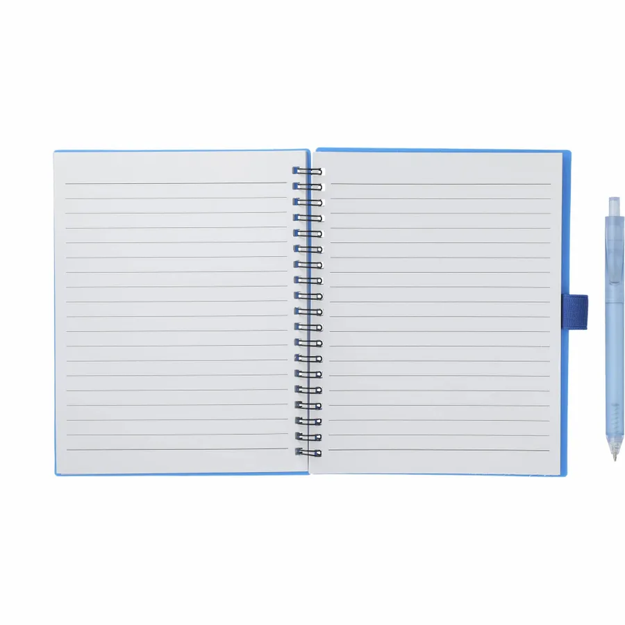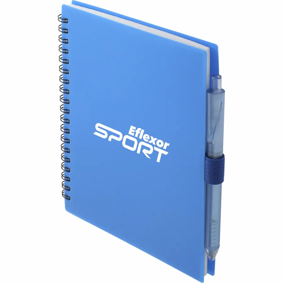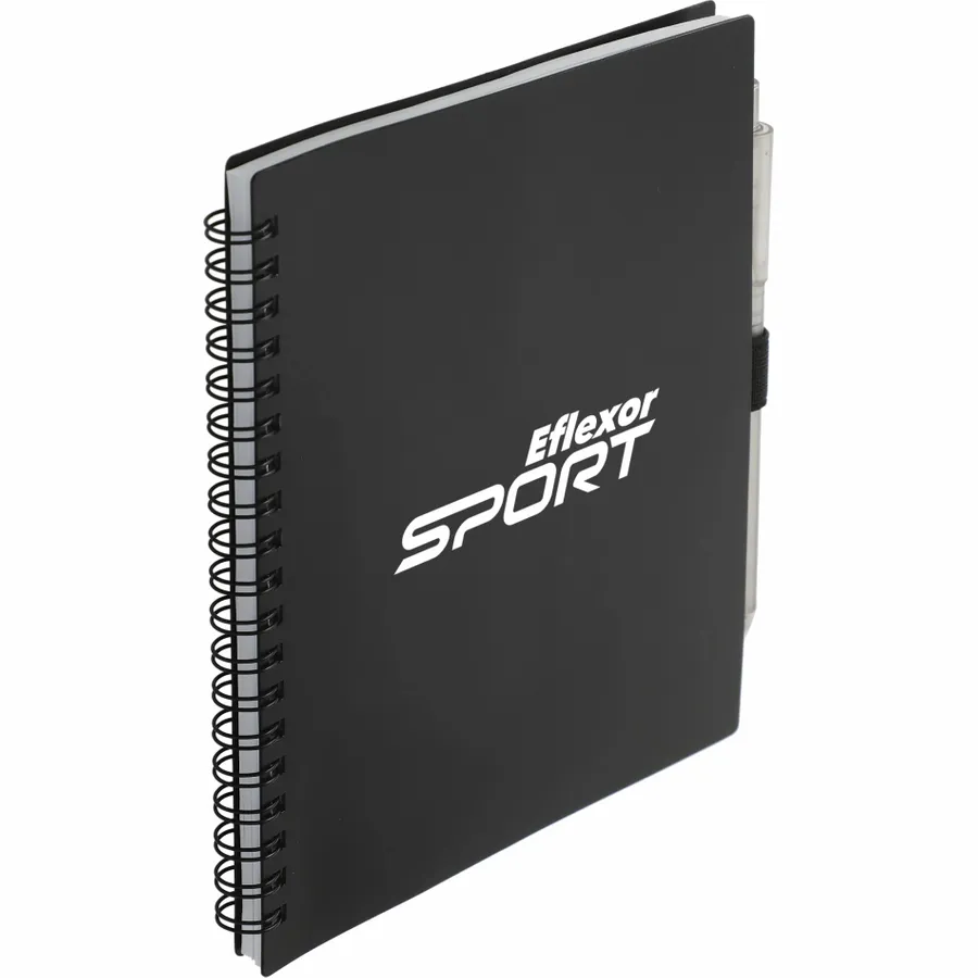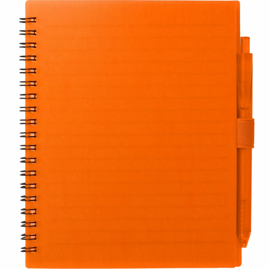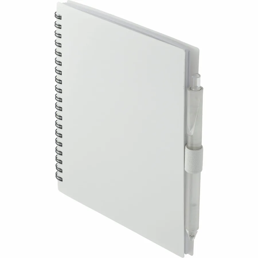 The 5.5” x 7” FSC Recycled Spiral Notebook with RPET Pen features a 100% recycled polypropylene, hard cover with 70 sheets of white lined FSC-certified paper. Black metal wire binding paired with black elastic pen loop. Includes 100% RPET barrel pen with black ink cartridge. Through a partnership with 1% For The Planet, one percent of sales of all EcoSmart products are donated to environmental nonprofits. Note that pens are packed separately.