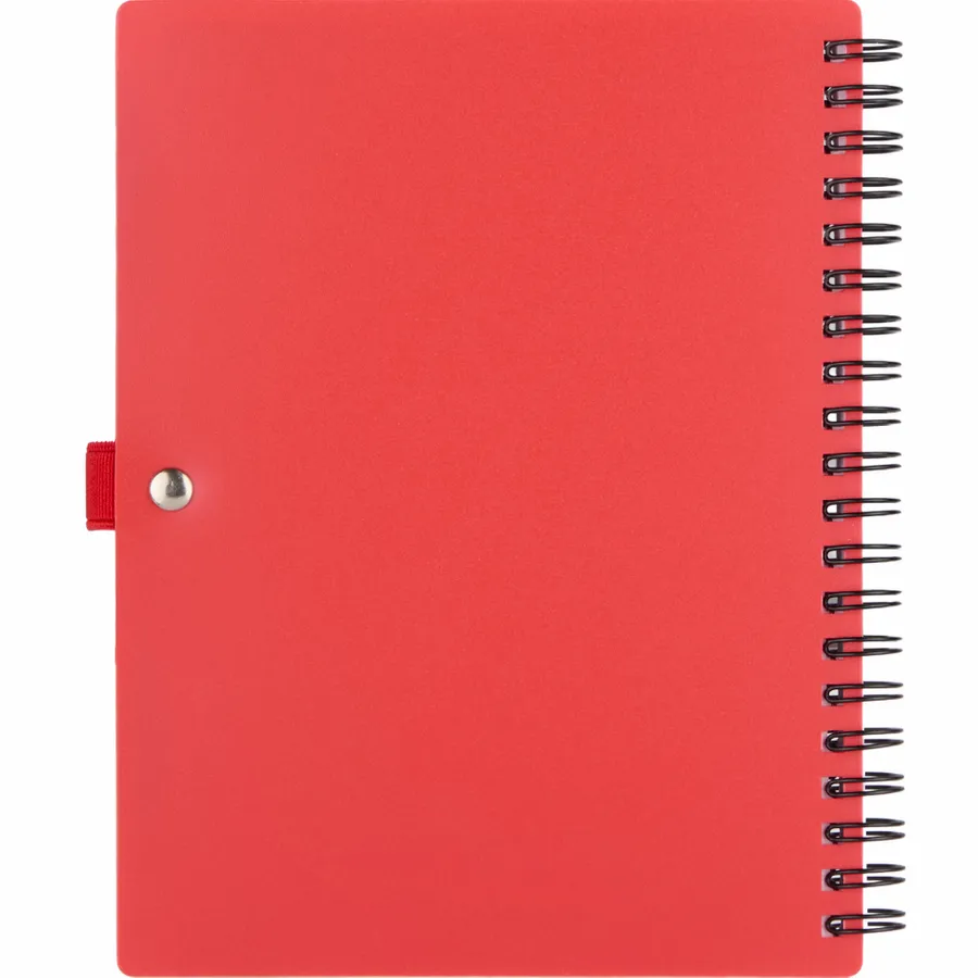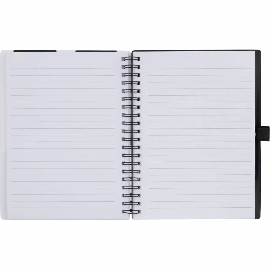 The 5 x 7 FSC Recycled Stash Spiral Notebook keeps notes tidy and accessible. Its durable 100% recycled PP cover includes two front pockets and a business card slot, plus a matching pen loop. The spiral binding lays flat for comfortable writing across 80 sheets of FSC recycled paper—ideal for meetings, classes, or daily journals. By choosing this notebook, youre making a positive impact on the environment, as one percent of sales are donated to environmental nonprofits through a partnership with 1% For The Planet.