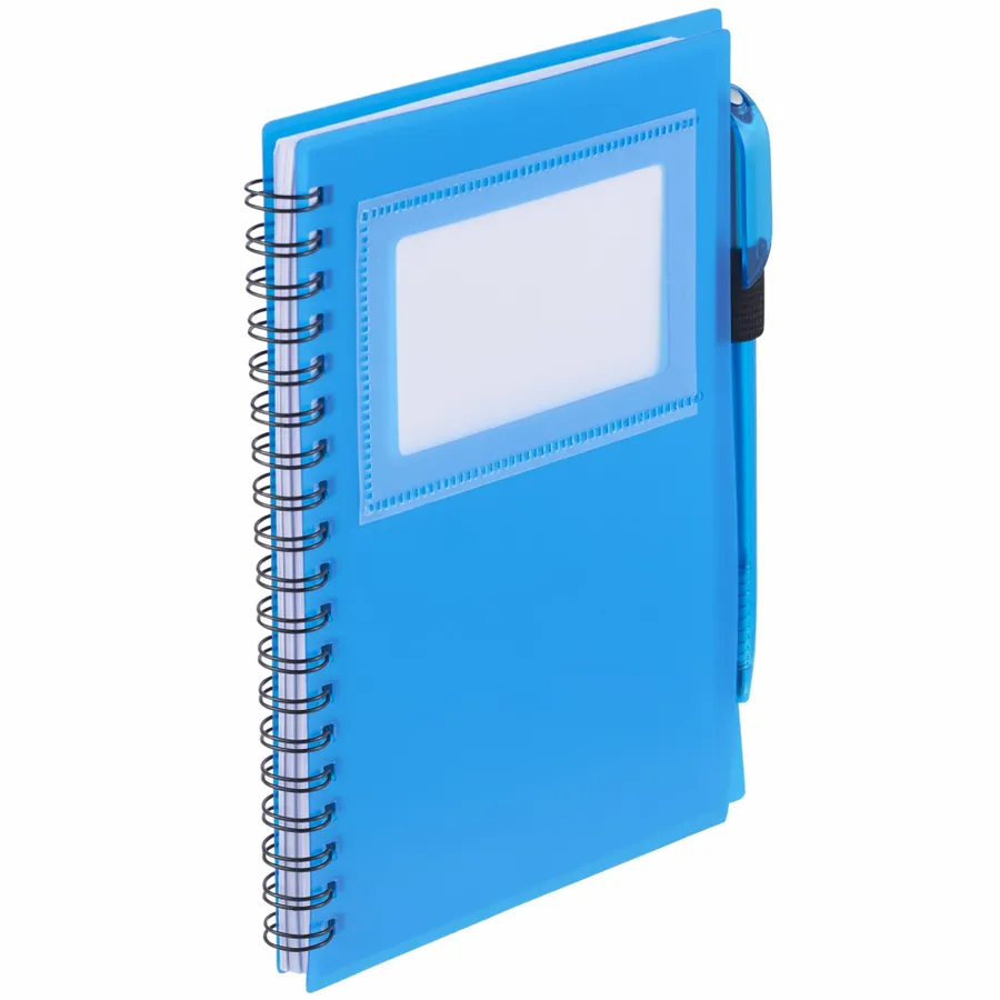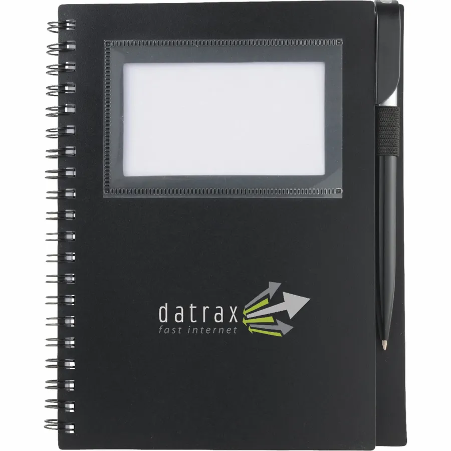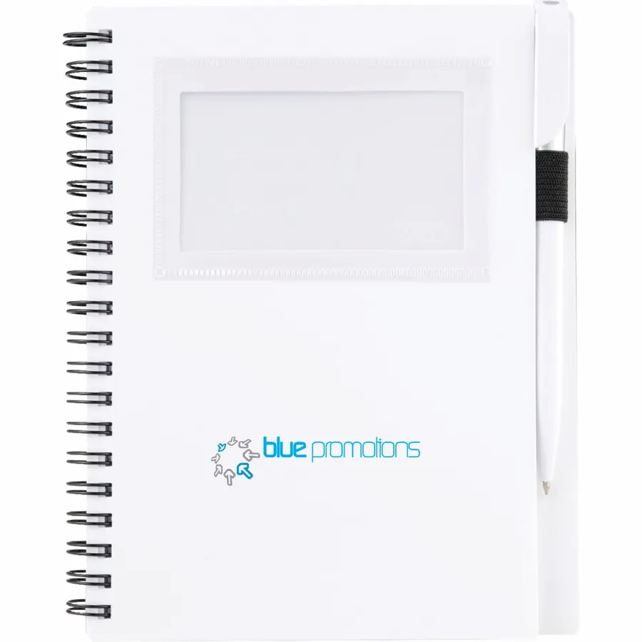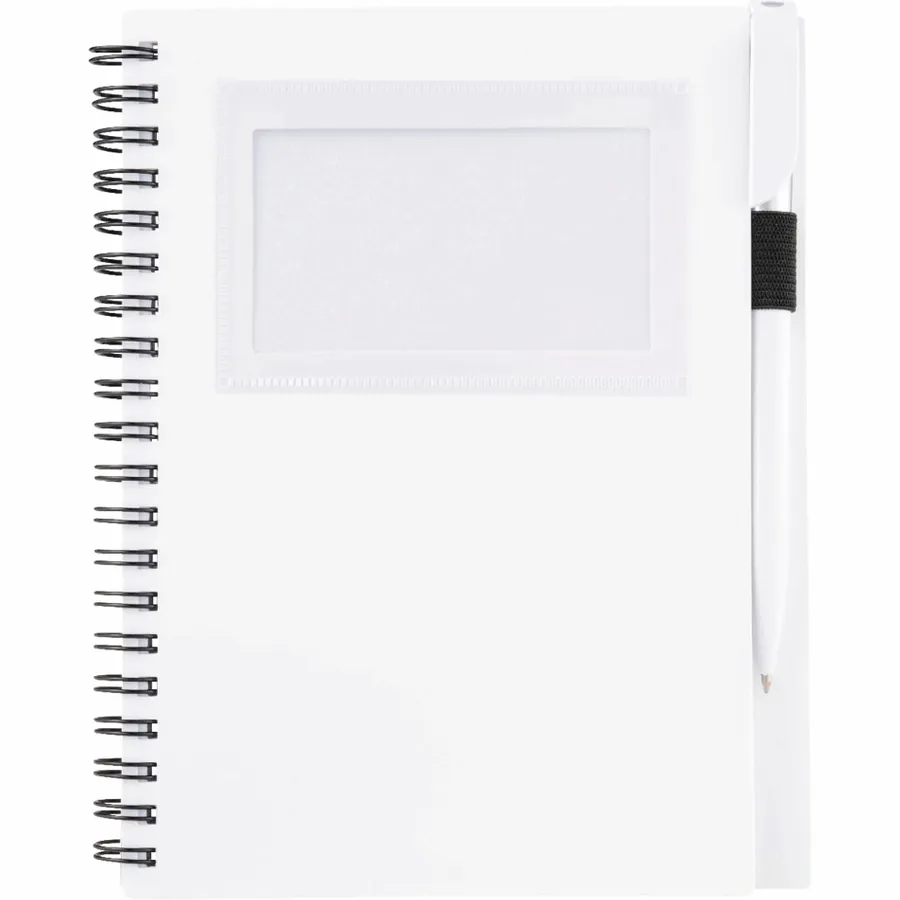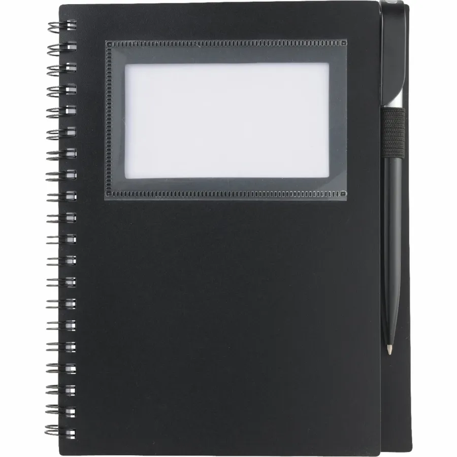 The Bullet 5.5 x 7 FSC Mix Star Spiral Notebook with Pen has a clear window on its sturdy polypropylene front cover to display your photo ID or store business cards. It comes with a matching twist-action ballpoint pen, which stores neatly inside the notebooks built-in pen loop. The Star Spiral Notebook contains 70 ruled sheets of FSC Mix paper and will be packed separately from the included pen.